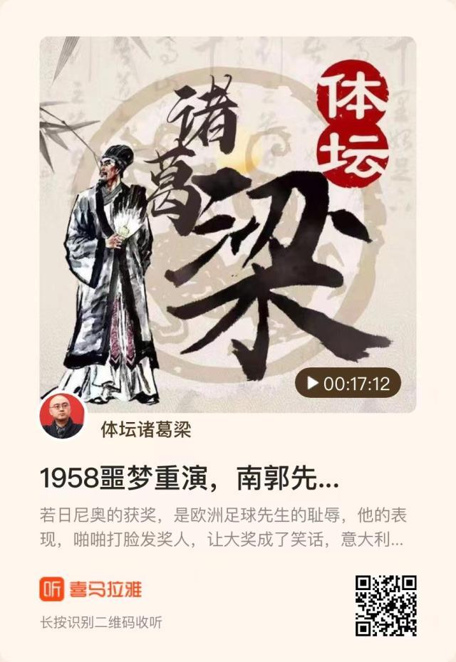 由《体坛周报》与喜马拉雅FM联合推出的播客节目——《体坛诸葛梁丨梁熙明电台》正式上线。 若日尼奥的获奖,是欧洲足球先生的耻辱,他的表现,啪啪打脸发奖人,让大奖成了笑话,意大利说不定就死在这位先生手里 点击下方链接,或扫描二维码,即可进入“体坛诸葛梁”收听节目,与梁熙明就足坛热点展开交流。 1958噩梦重演,南郭先生害得意大利世界杯又没出线?...