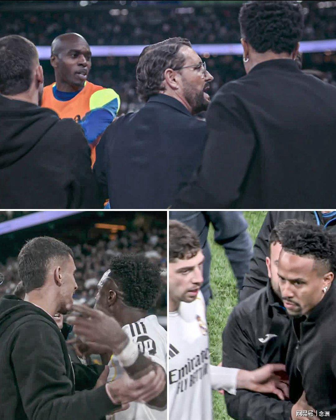 皇马0-1赫塔费的比赛结束后,据记者Jose Padilla消息,巴西球星维尼修斯、米利唐与赫塔费球员恩约姆发生冲突,只得被工作人员拉开,目前还不知冲突的具体原因。