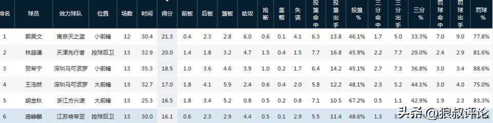 截止目前,庞峥麟代表江苏出战13场比赛,场均登场30分钟,得到16.1分2.9篮板4.4助攻,投篮命中率为48.6%。排在本土得分榜第六的位置。